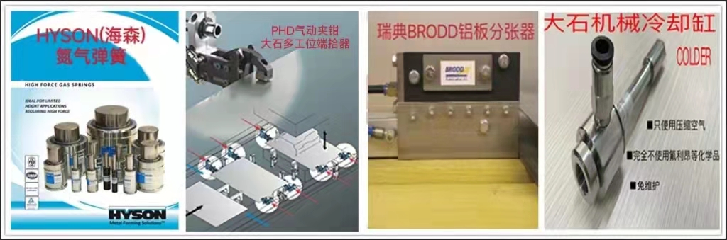 本公司是HYSON氮氣彈簧在中國的總代理,并提供管路設(shè)計及售后服務(wù)。同時還代理美國PHD氣動夾鉗、SWEDEN機(jī)器人平衡缸、美國LSP噴涂系統(tǒng)、法國PRONIC模內(nèi)攻絲機(jī)等。另外,本公司還提供多工位模具自動化端拾器產(chǎn)品,從設(shè)計、制造、運輸、安裝、調(diào)試為客戶提供整套“交鑰匙”工程。